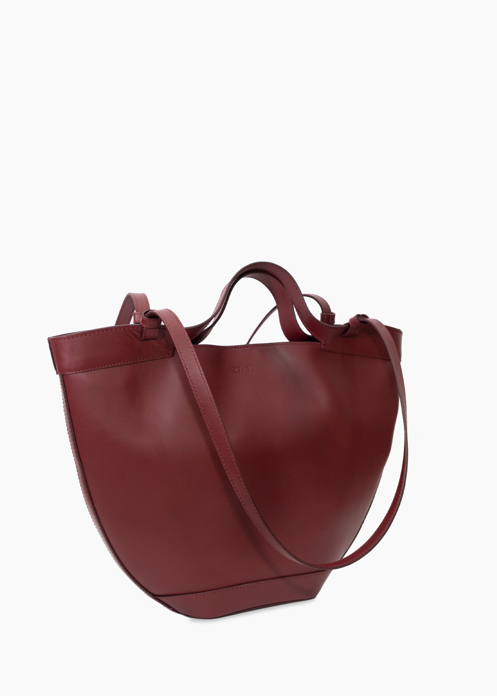 Cuenta con doble asa integrada en el diseño: una asa corta para llevarlo a mano y otra más larga para llevarlo al hombro con comodidad. Ambas se fusionan con precisión en la estructura del bolso, manteniendo la continuidad de la forma.